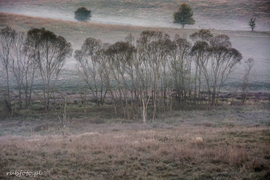 Już za trzy dni kolejna sobota, a ja jeszcze nie pokazałam zdjęć z ubiegłej. Udało się nam wstać o piątej rano, zajechaliśmy w piękne okolice warmińskiej wsi Maruny około szóstej, czyli grubo przed wschodem słońca. Niebo już powoli jaśniało, termometr w aucie pokazywał zero stopni, Janusz chodził z psem i marudził, że marznie, a ja biegałam z aparatem i zimna nie czułam. Mgła unosiła się nad dolinką, pajęczyny otulały trawy na łące, a daleko, za górką i za lasem powoli wstawało słońce...